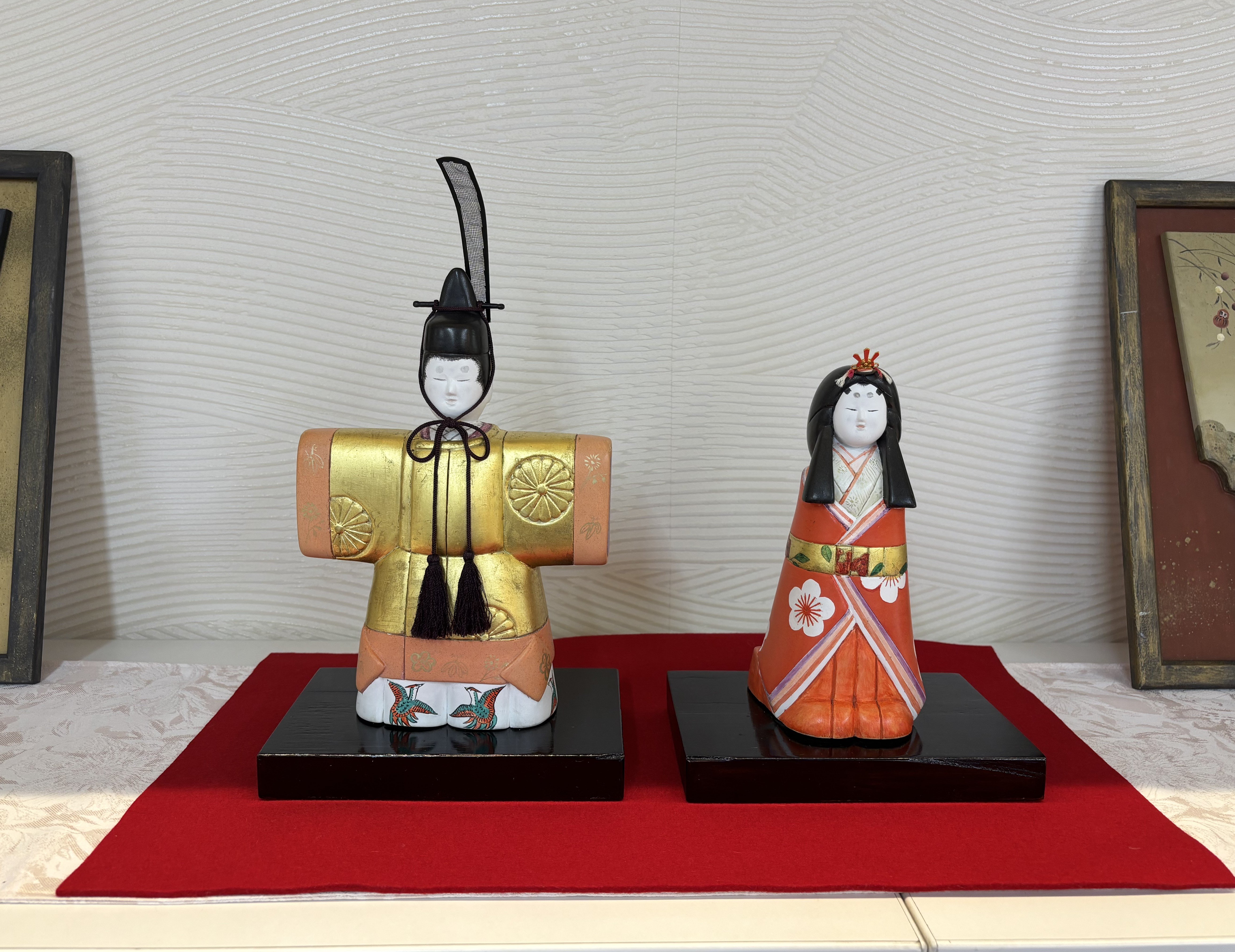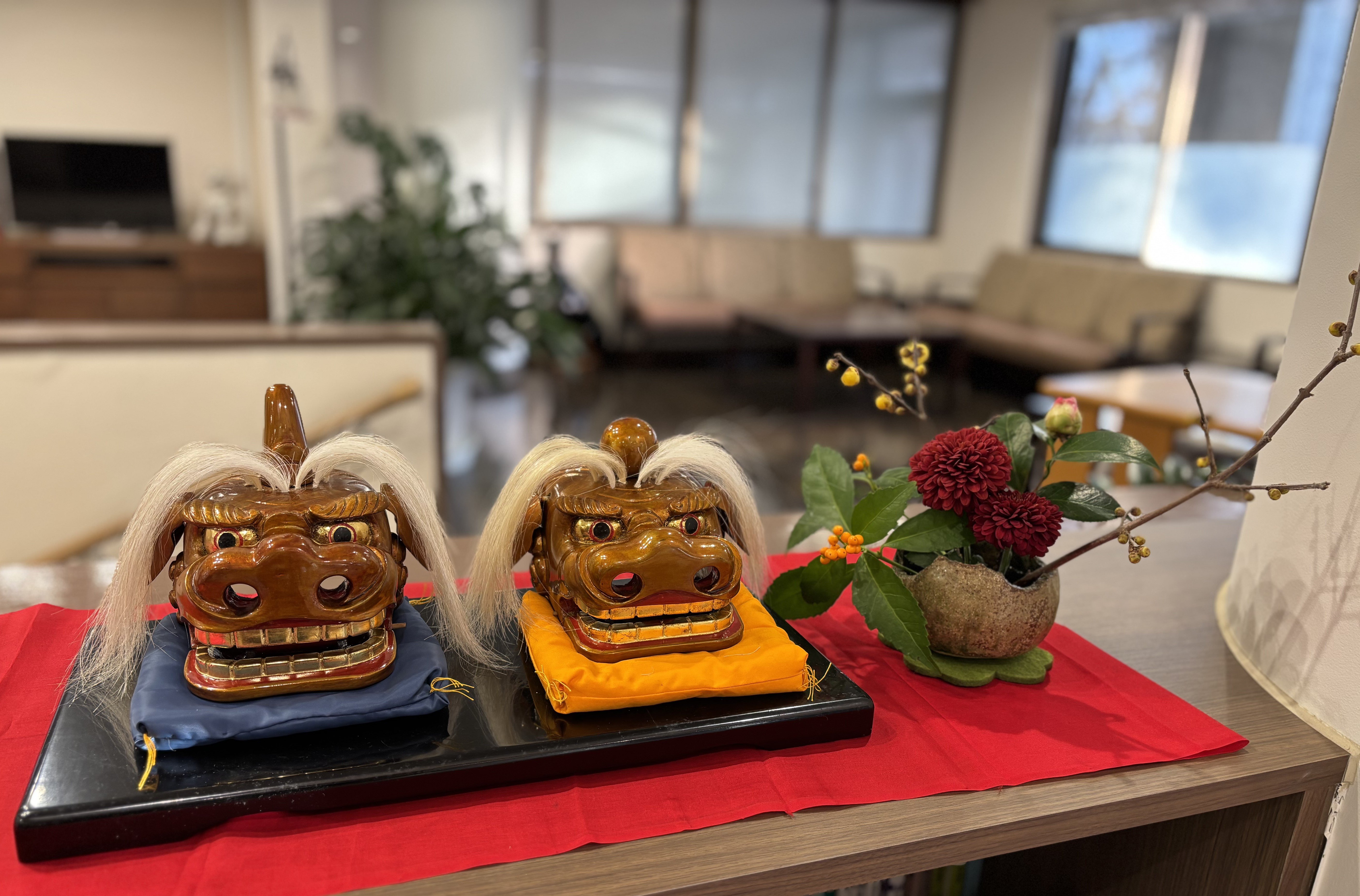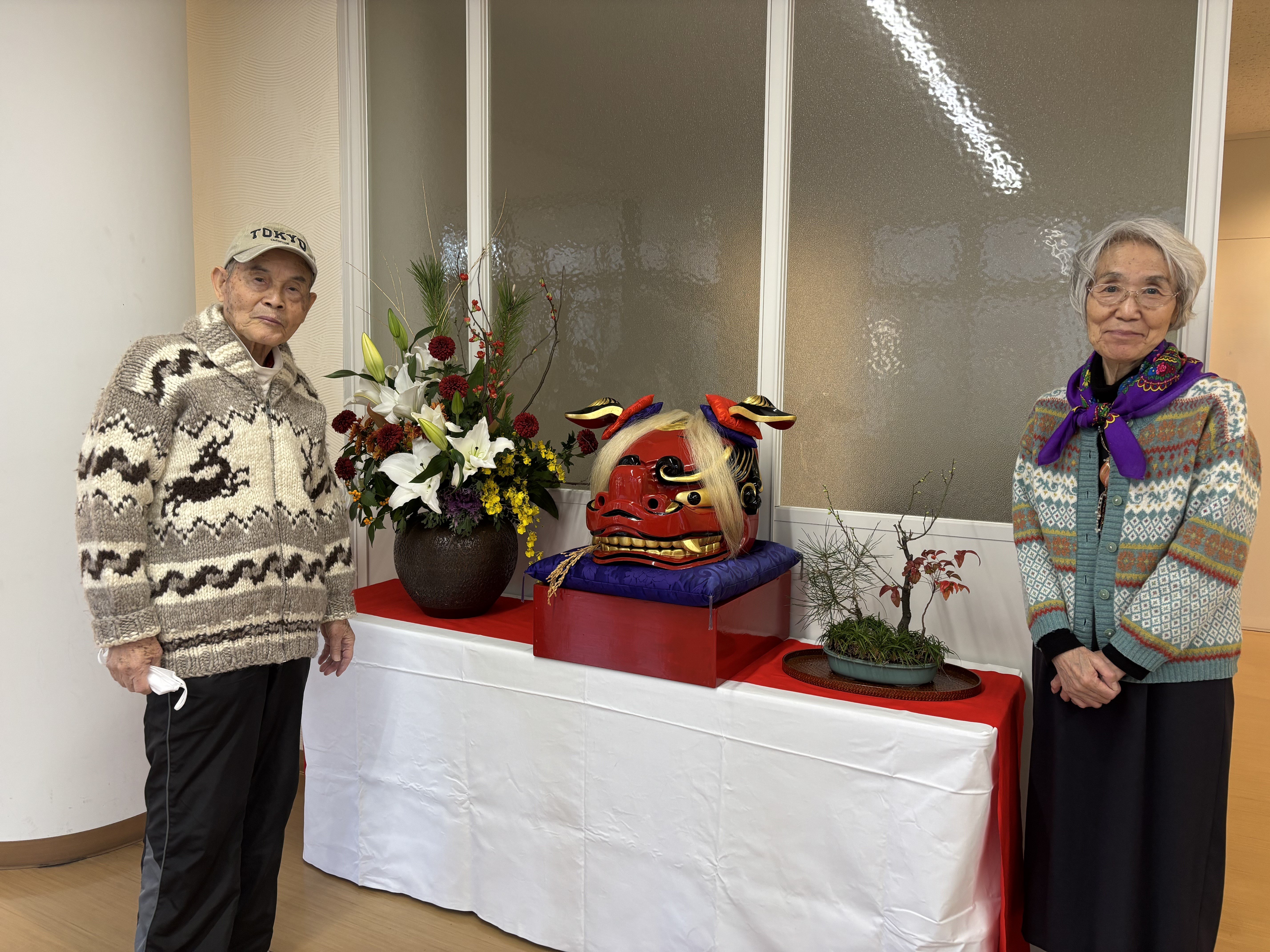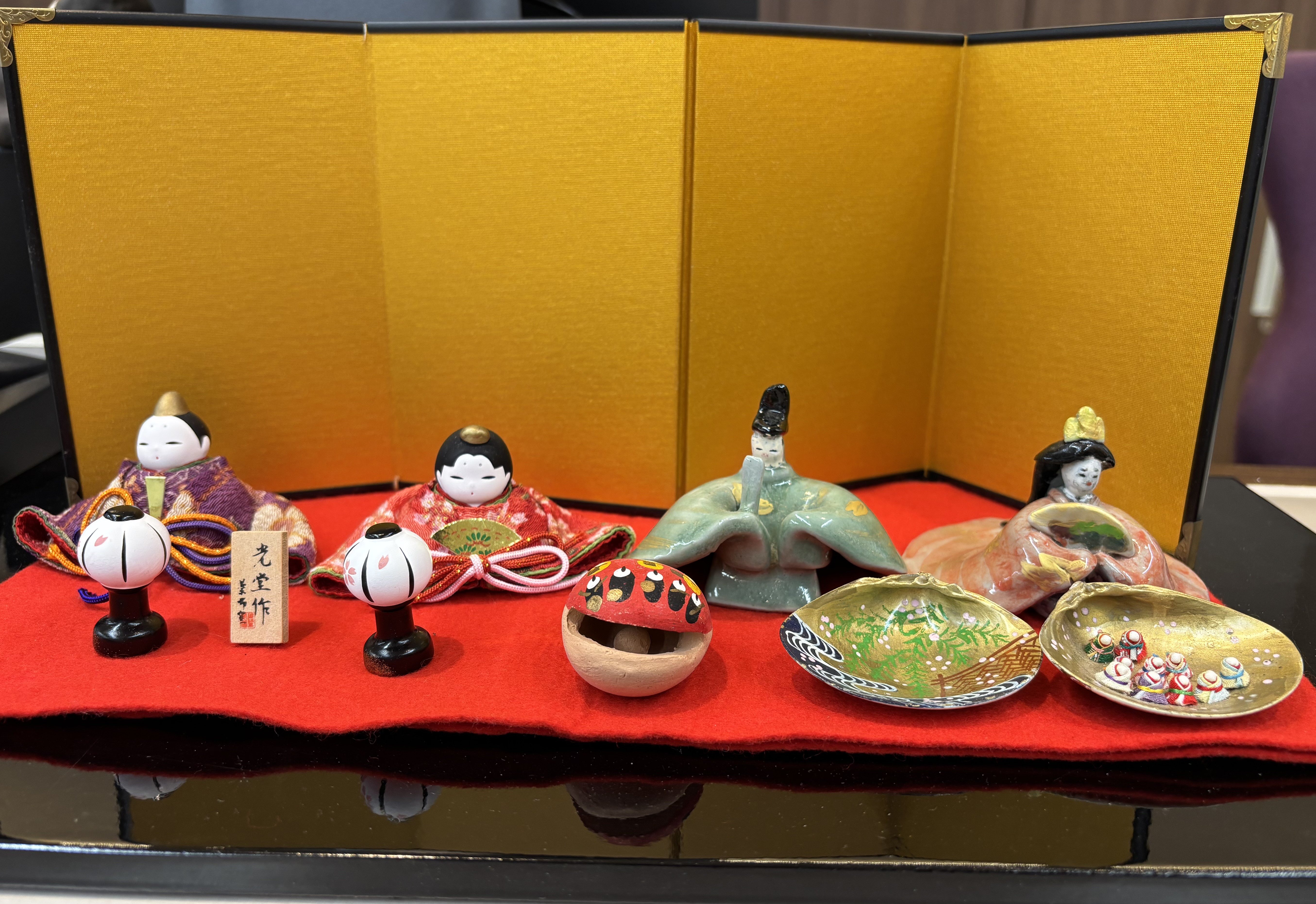 「このお雛様は、主人が1本の木から切り出して色を付け、仕上げたものです。趣味で始めた『能面作り』を応用して、お雛様を作りました。能面もお雛様も表情が命‥‥。優しい表情に拘りました。ぜひ皆さんに見てもらいたいと思い、コミュニティカウンターに飾ってもらいました。」(入居者E様ご夫婦)