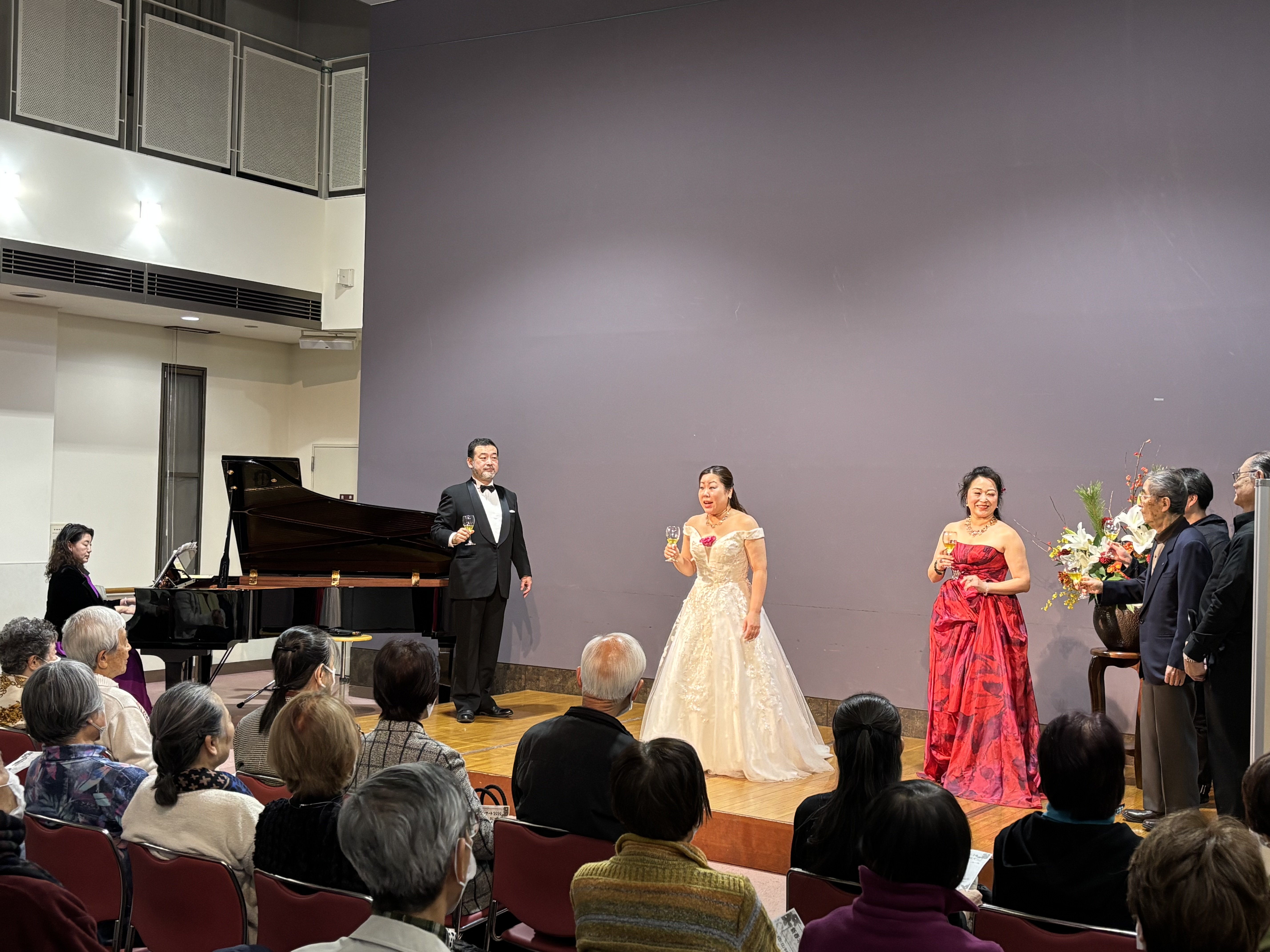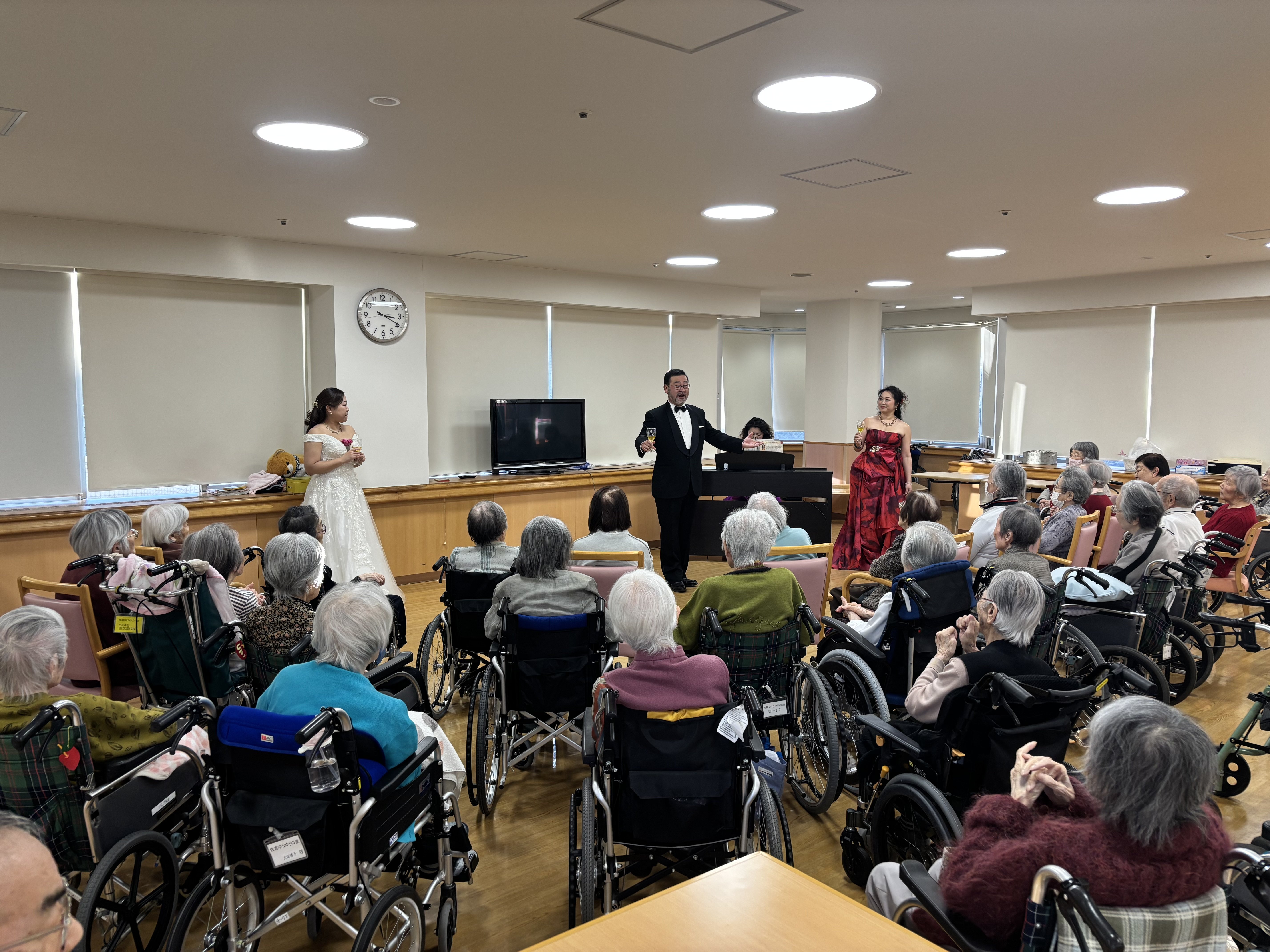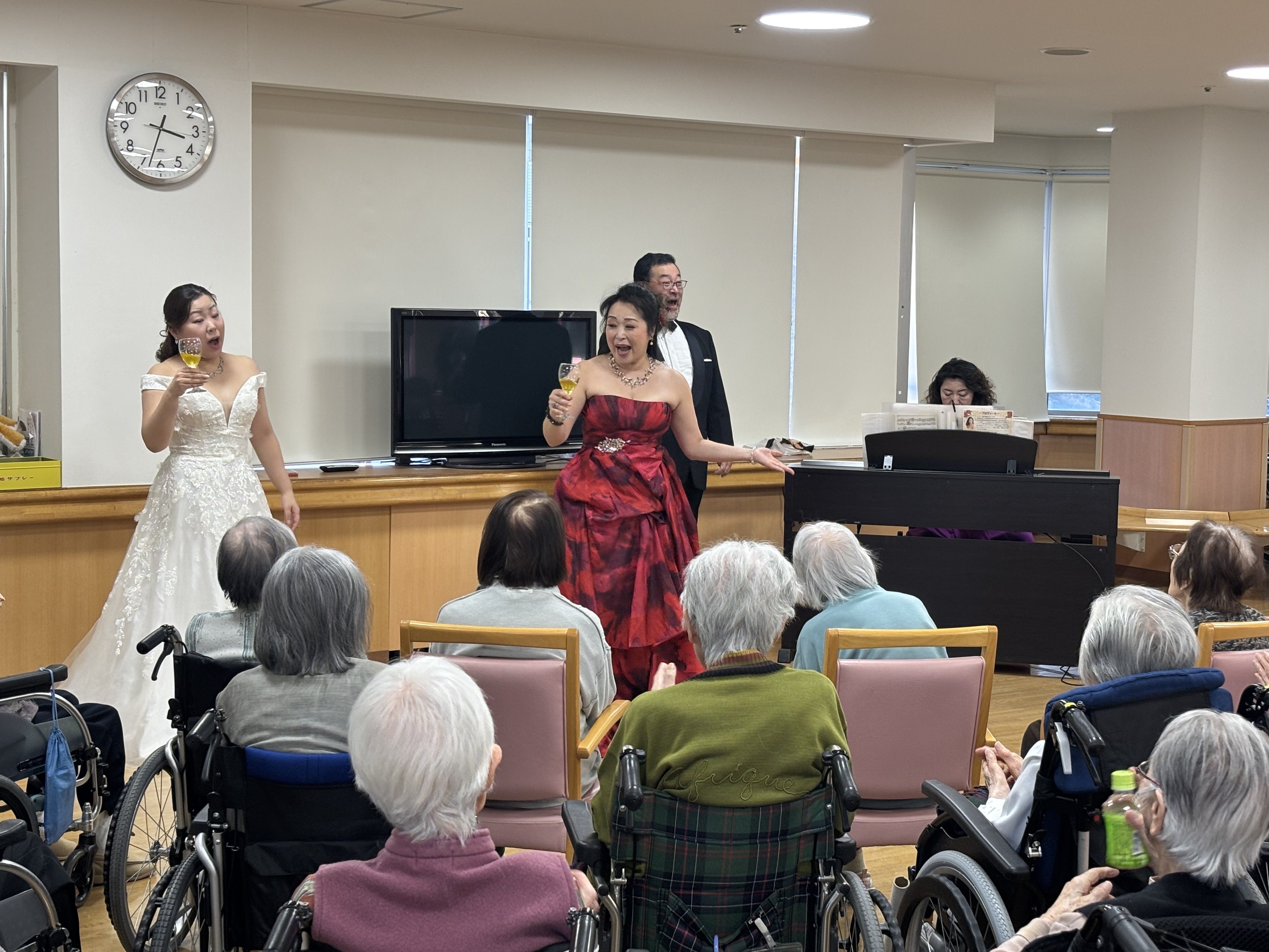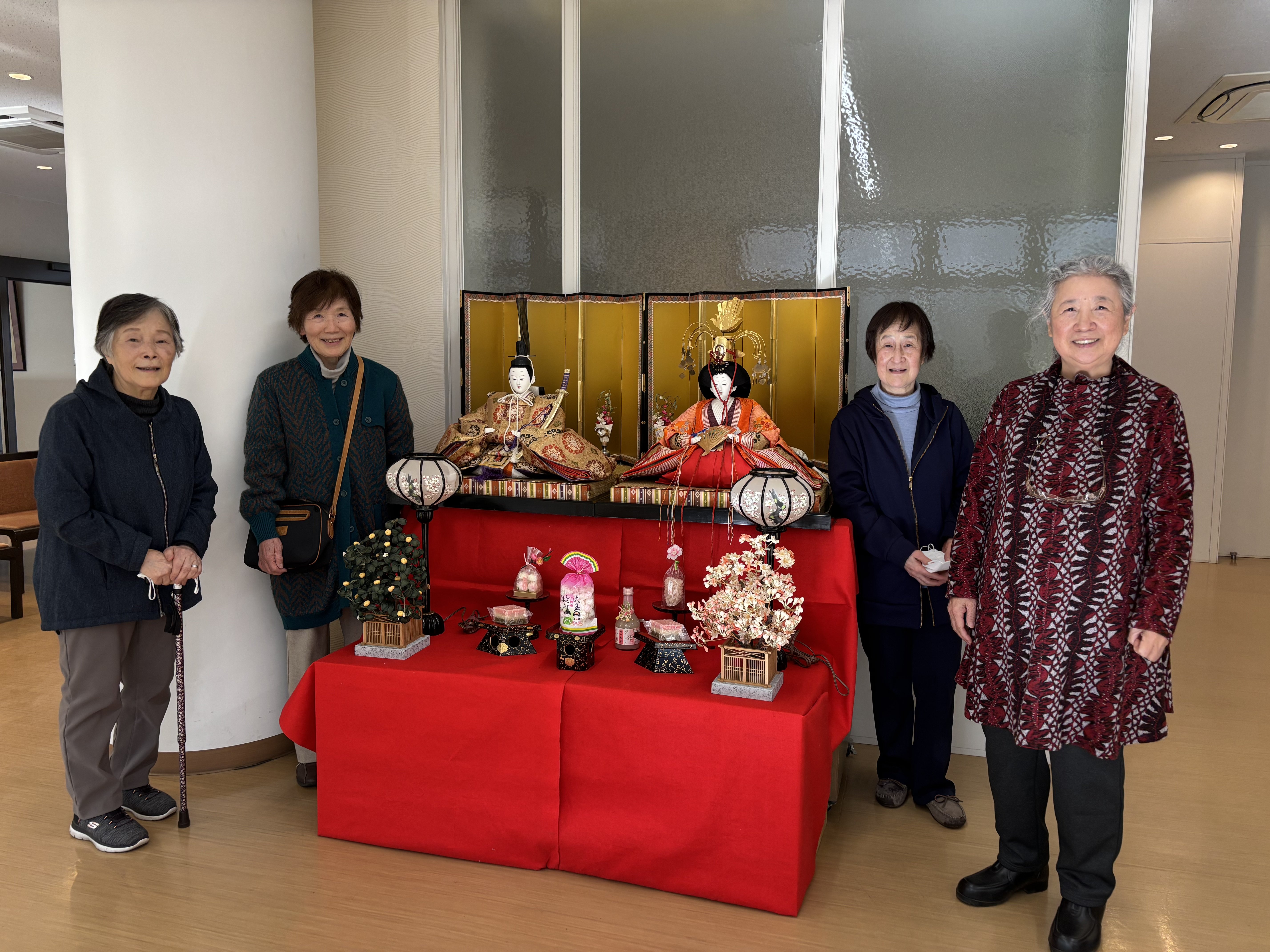「昼食後、たまたま行き会ったお友達とお雛様を見ていたら、職員さんに里の『三人官女』ですね。と声をかけられました。お風呂でいつも会うお友達のWさんも通りかかって、『四人官女』になりました。」(入居者K様、W様、T様、S様)