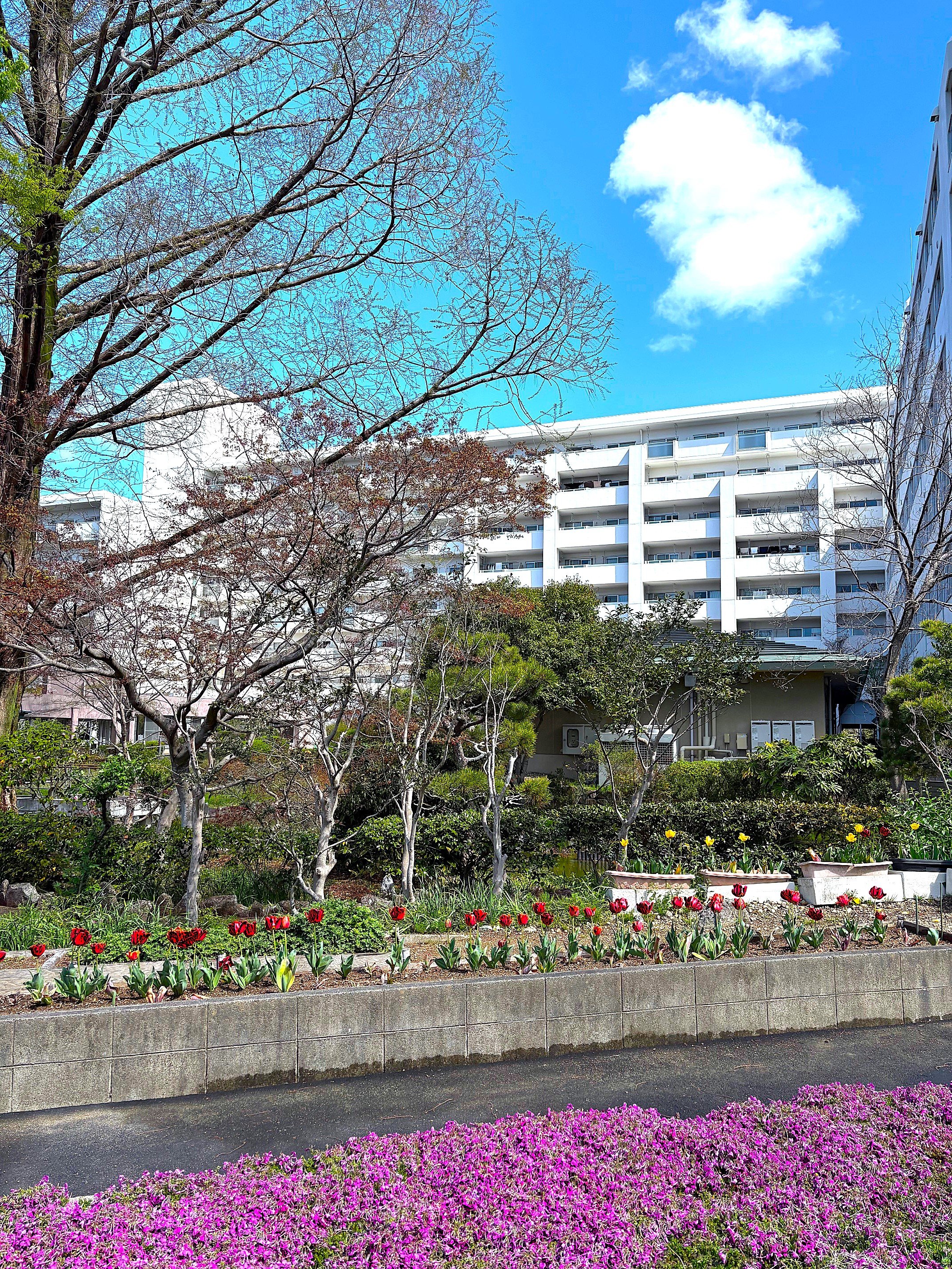 ケアセンターの4階から綺麗なチューリップがみえたので、お散歩に来ました🌷🌷🐝