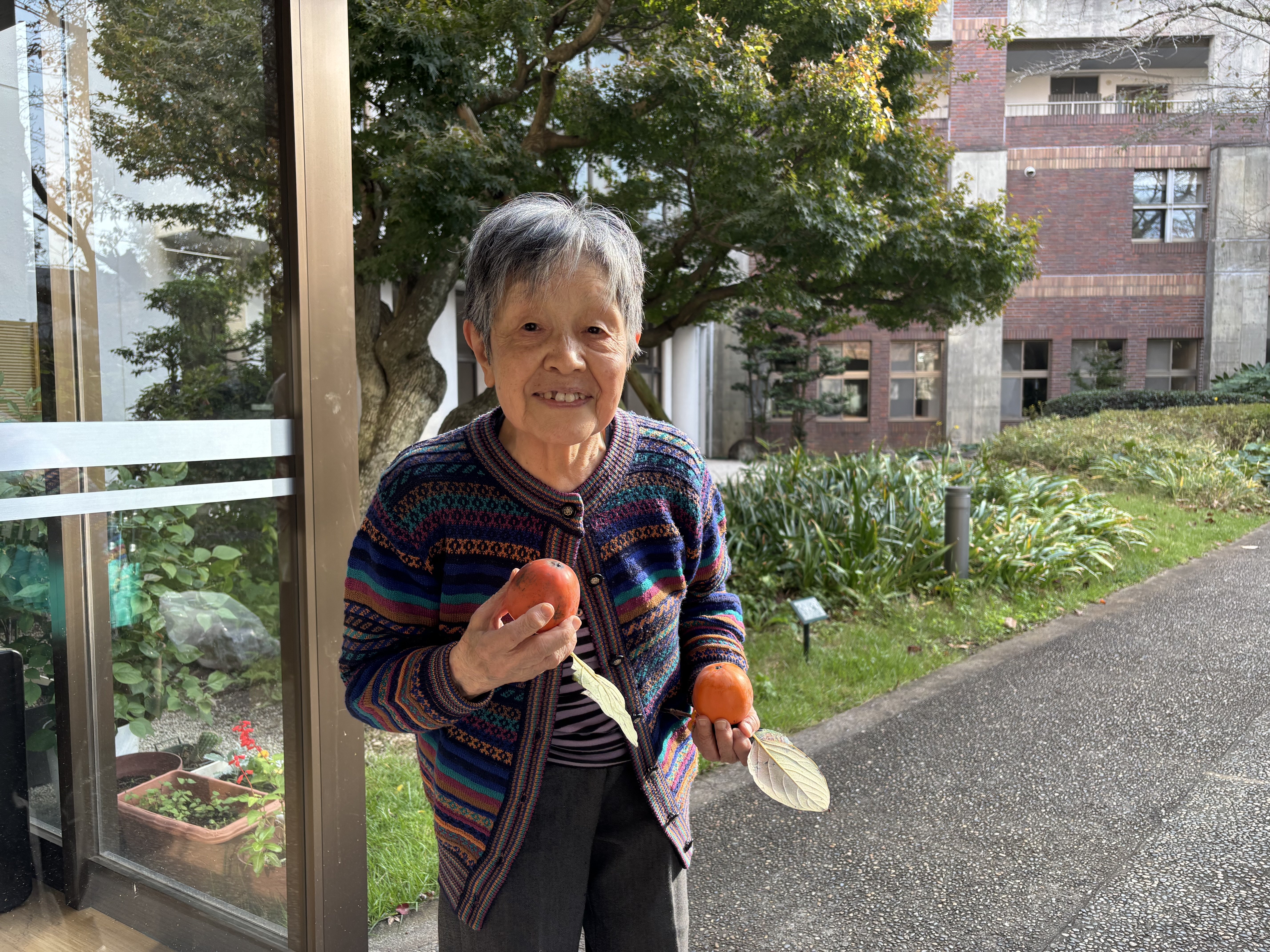 「かわいい柿ね。こんな実がなるのね。お部屋に持って帰って食べてみます。」
